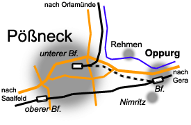 Hierbei handelt es sich um die 2,8 km lange Strecke zwischen Oppurg und Pößneck unterer Bahnhof, die am 15.10.1892 eröffnet wurde. Der Eigentümer der Strecke war die 'Saal-Eisenbahn' (wie die Orlabahn auch) und diente als Verbindung zwischen dem Orlatal und der 'Thüringische Eisenbahn', die Stecke Gera-Püßneck-Saalfeld. Dabei sollte sich der Weg über Saalfeld (mit der Saalebahn) verkürzen. Nach dem Krieg wurde die Strecke komplett demontiert, als Reparationsleistung an die damalige Sowjetunion. |